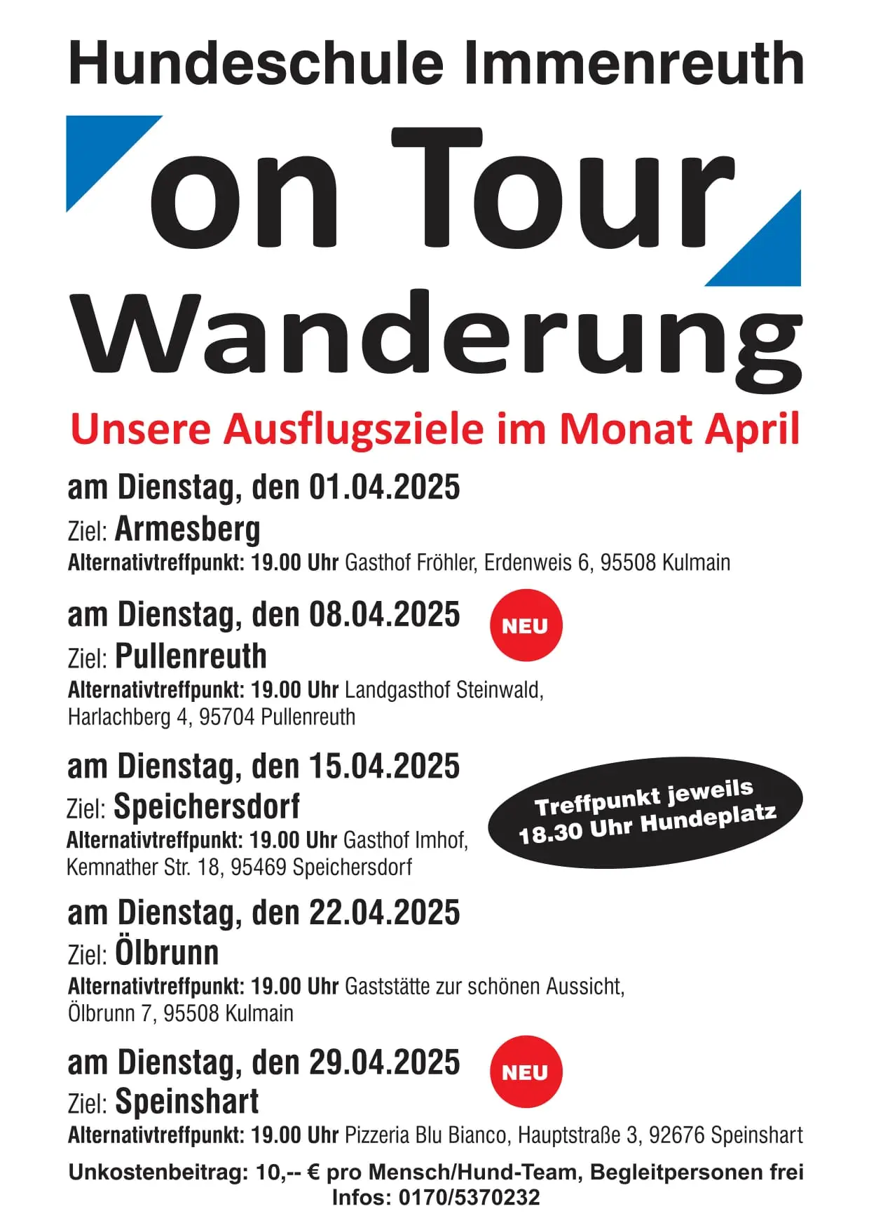 Alternativtreffpunkt: 19.00 Uhr Pizzeria Blu Bianco, Hauptstraße 3, 92676 Speinshart